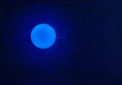 In questo continuum cronologico ed evolutivo, l’artista presenta poi installazioni tridimensionali luminose monocrome, che amplificano le tematiche già evidenziando il percorso di sinaptici collegamenti per un do ut des: lavori realizzati con materiali e tecnologia semplici (materiali come fili, lampadine led, sfere in plexiglass, smalti, foto, quotidiani, radiografie e altro ancora), che si presentano al visitatore con sfere luminose su basi uniformi di vari colori, come satelliti dai quali partono fili opachi, come rami di vegetazione, segnali di vita. Appartengono a questa sezione opere delle serie Frammenti e Filo conduttore. Fili radicati sorgono e viaggiano su tragitti liberi per relazionare “Mondi” (sfere) e realtà differenti (nell’opera Filo conduttore 6 le sfere, come nel sistema Copernicano, orbitano nell’immenso giallo solare come pianeti culturali relazionati da “fili conduttori”).